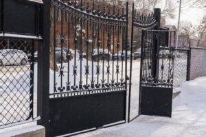 Old iron gate with ironwork unlocked with snowy scene falling and snow settling on metal. Winter city